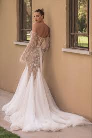 This Berta embellished couture gown features a timeless sweetheart bustier corset with elegant crossover draping on the bust. This fitted gown flares in to a mermaid skirt with dramatic tulle sectionals adding volume and drama. This gown is a nude champagne colour, embellished in dazzling large jewels in vertical lines throughout.