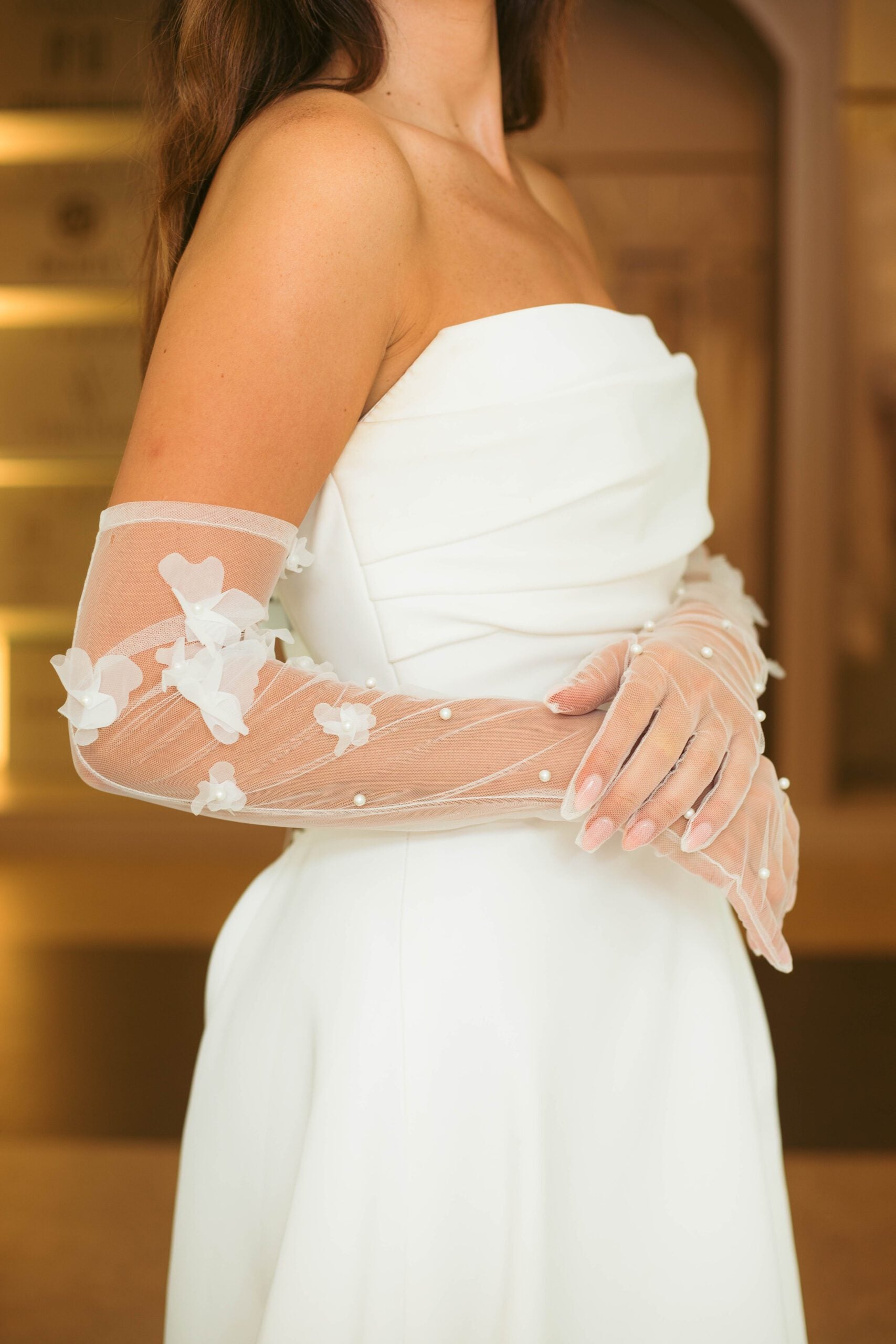 The Demi Gloves are stunning bridal gloves with pearls and 3D floral details, a beautiful and elegant addition to your bridal look.