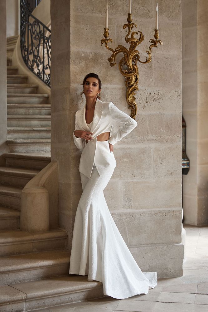Devon is a 3-piece jacquard combination with a modern blazer, a fitted mermaid skirt, and a couture sweetheart top.