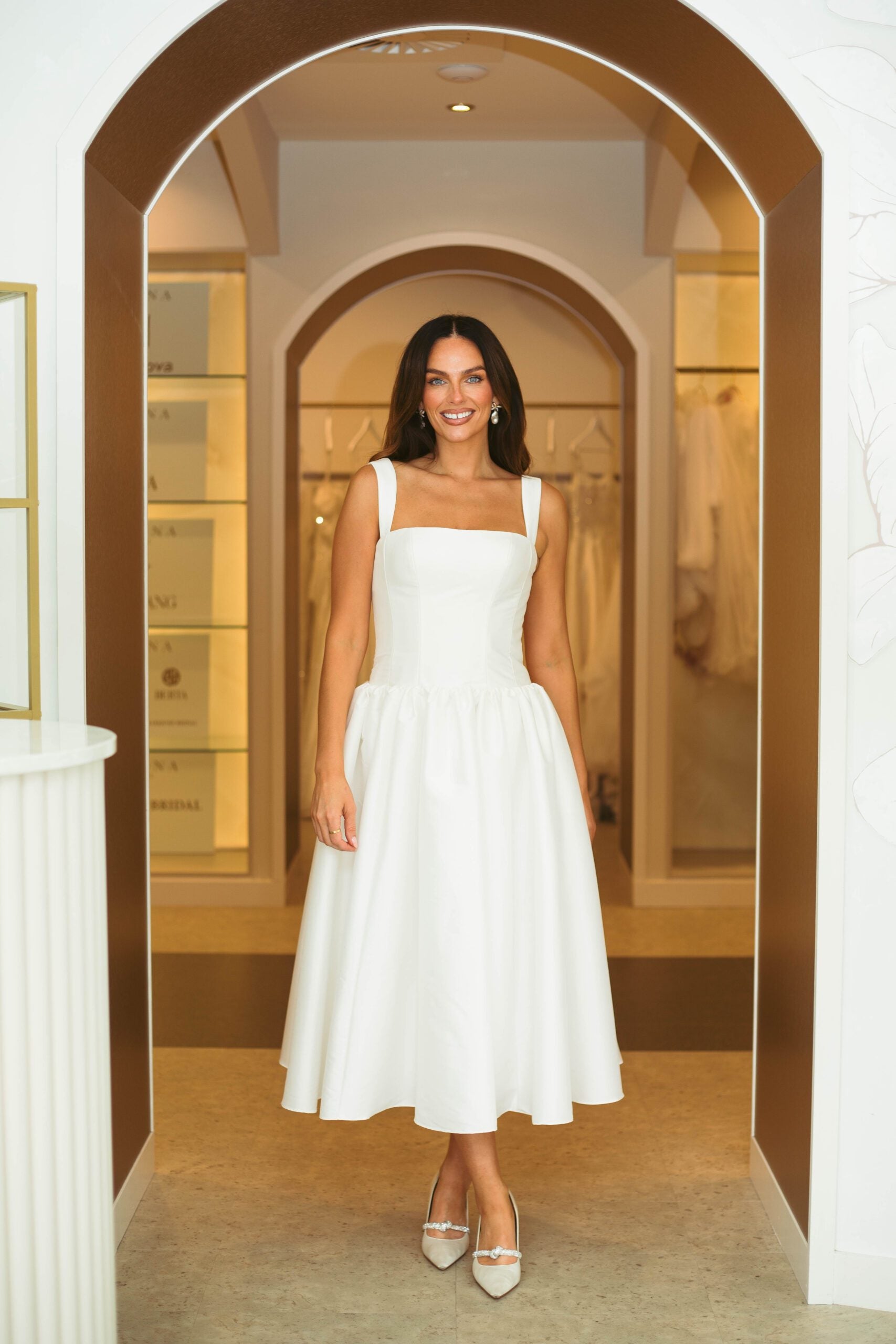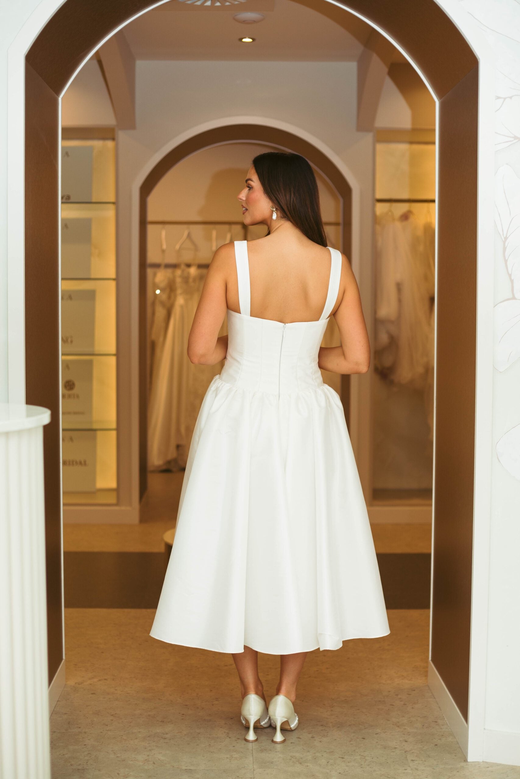 Lucille is a 90s inspired, classic T Length dress. Cut in a lustrous and lightweight Luxe Taffeta fabric, the structured bodice shapes your silhouette with thick straps for structure, while the full skirt is just made for twirling.