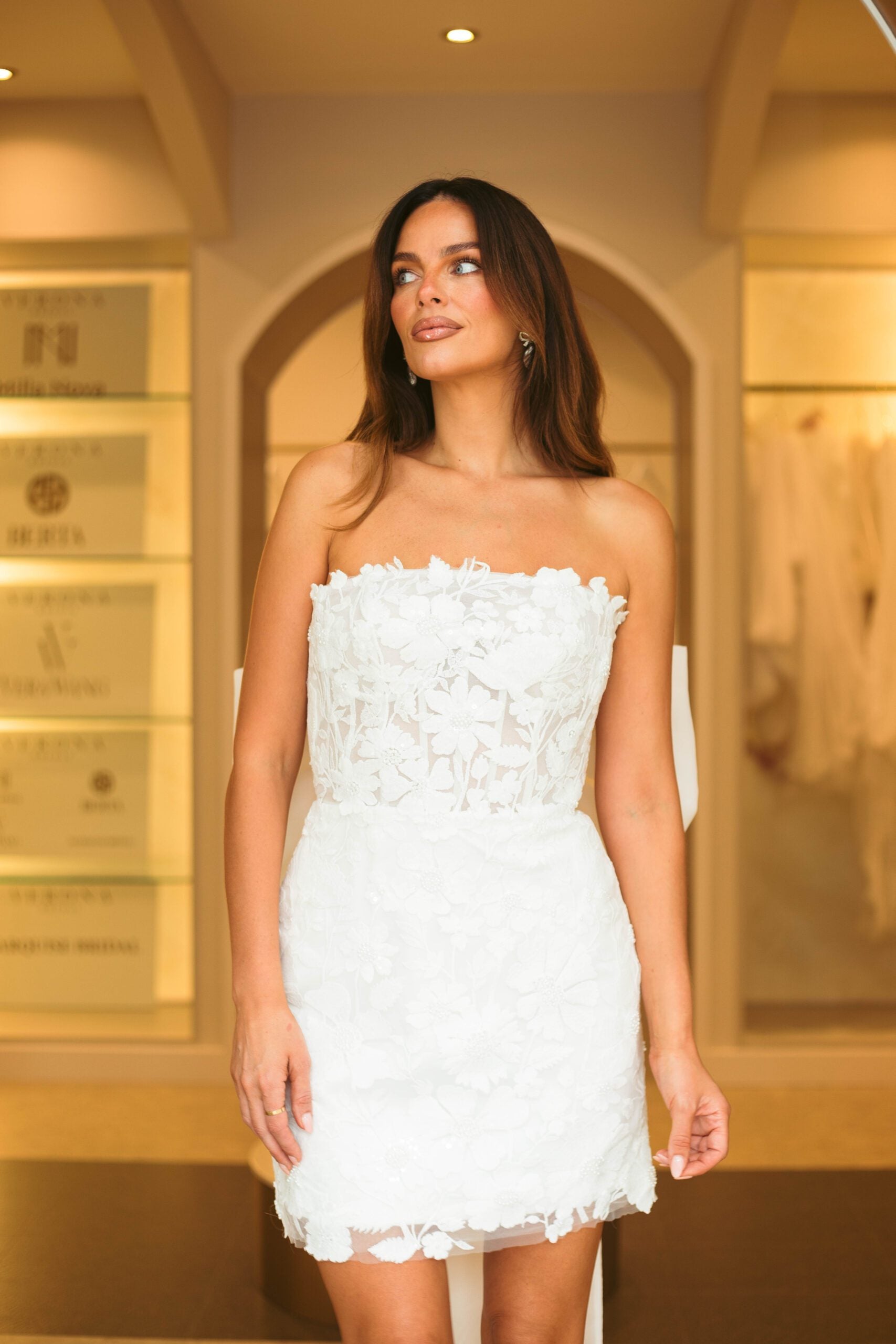 The Rosalie dress is a stunning strapless mini crafted from exquisite floral lace. With boning in the bodice for a flattering fit and a fun, detachable oversized bow on the back.