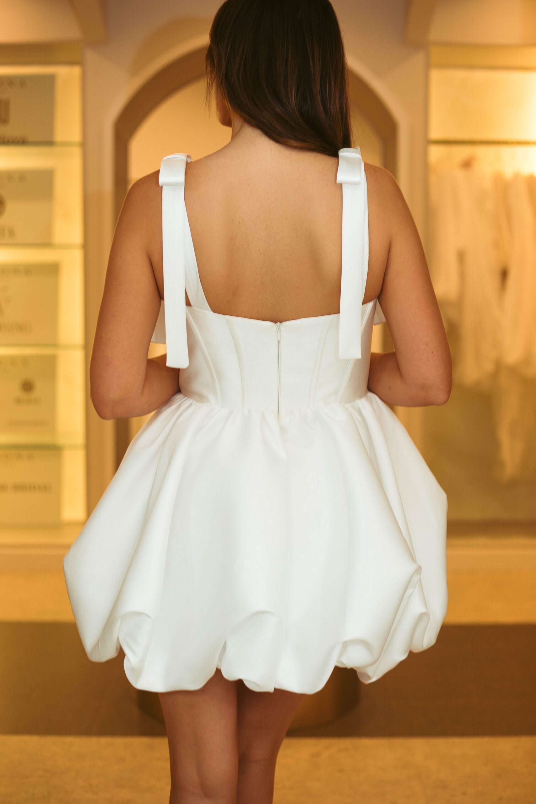 Sasha features a gorgeous boned bodice with nine pieces of boning offering unbeatable structure, complimented by a bubble skirt, all in signature Mikado fabric. The top bow details are removable with a clear snap closure.