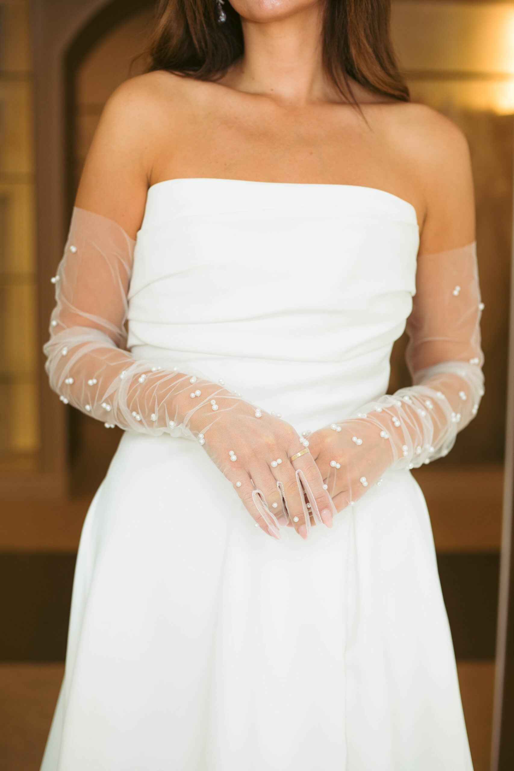 Delicate sheer tulle opera length gloves, sprinkled with delicate pearls throughout the whole length by MillaNova.
